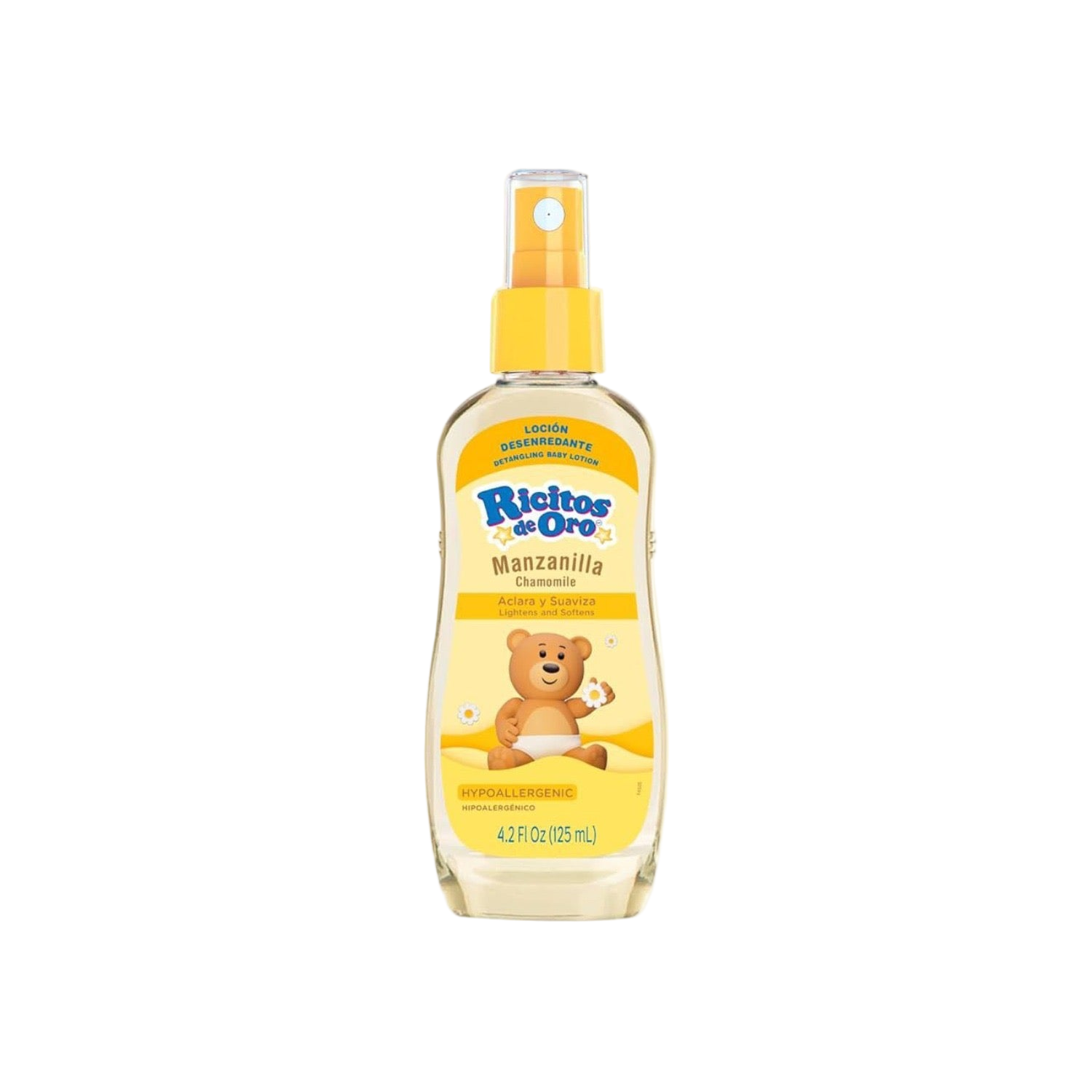 Loción desenredante Ricitos de Oro Manzanilla formulada con extracto natural de manzanilla para desenredar y suavizar el cabello delicado. Su fórmula ligera facilita el peinado sin dejar residuos, protegiendo la fibra capilar mientras proporciona brillo y manejabilidad. Ideal para cabellos rizados, ondulados o con tendencia al encrespamiento. Presentación de 125ml, perfecta para uso diario en toda la familia.